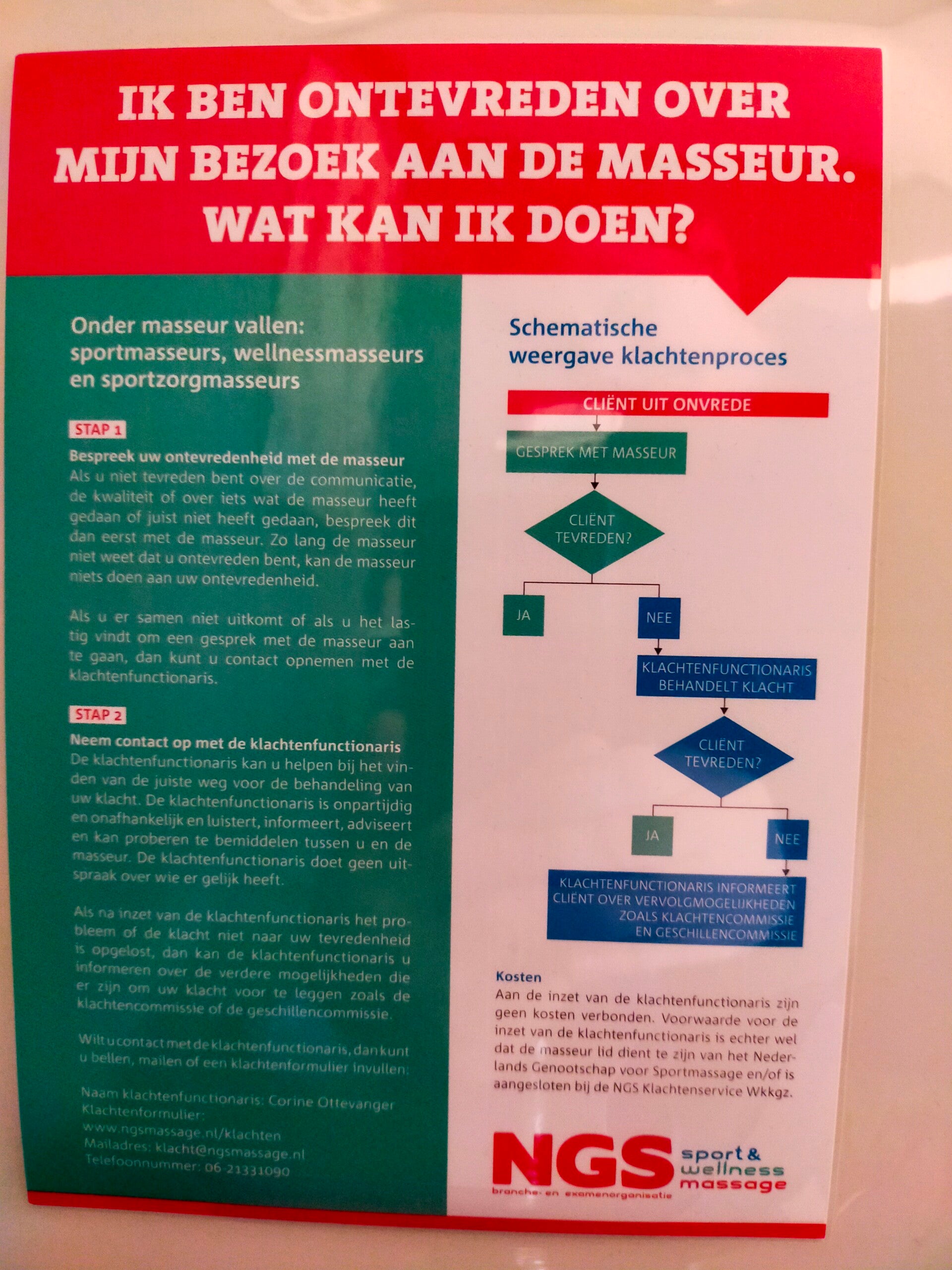 Massagestudio Deventer is aangesloten bij de klachtenservice van het NGS en voldoet aan de eisen voor de Wet Kwaliteit, Klachten en Geschillen Zorg (WKKGZ). Deze wet regelt eventuele klachten tussen klanten en hun 'zorg'-aanbieder.